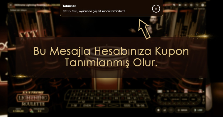 Casino Metropol canlı casinoda kampanya dahilindeki masalarda oynayarak başlayın. Kampanya için gereken bahisi oynadığınızda kupon kazanırsınız. Kupon kazandığınızı da aşağıdaki görselde görebileceğiniz gibi bir mesajla size bildiririz.